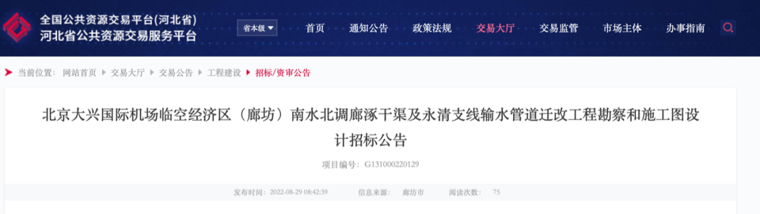 近日,临空经济区(廊坊)一批项目发布招标公告。涉及生命港综合基础建设项目、物流中心河及航企暗涵明渠段水系治理、南水北调廊涿干渠及永清支线输水管道迁改工程等。
