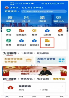 第三步,在“冀时办”首页左上角选择所在城市(选择到市级即可),并进入“住建”模块。